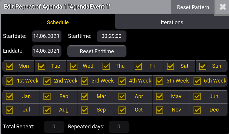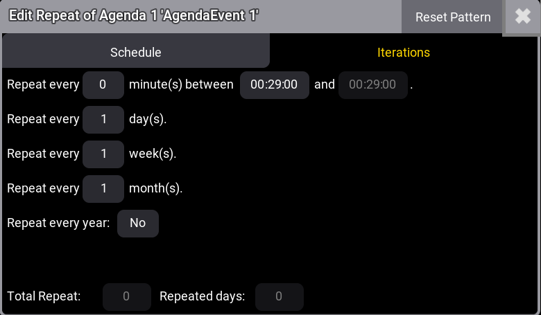 There are two main settings to define the repetition of an agenda entry, Schedule and Iterations.