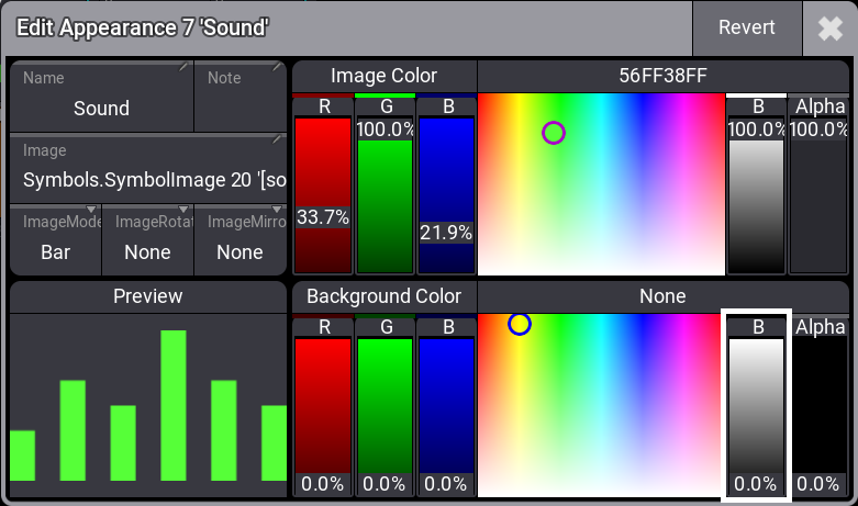 The Background Color fader and color picker can be used to change the background of the appearance. The default background is transparent (Alpha fader at 0%, B fader at 0%).