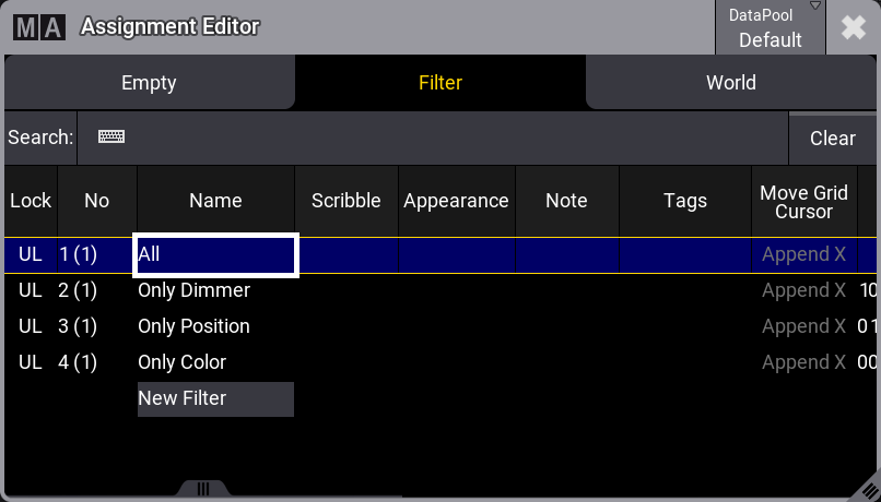 Editing the Break cell for cue number 7 opens the Assignment Editor. Select Filter and then tap All to select it.