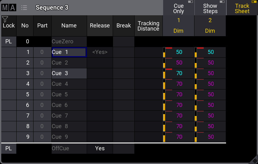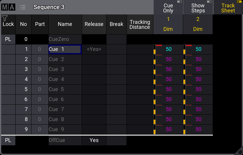 The starting point for this example is a simple sequence with nine cues and two fixtures dimmer value set to 50% in the first cue: