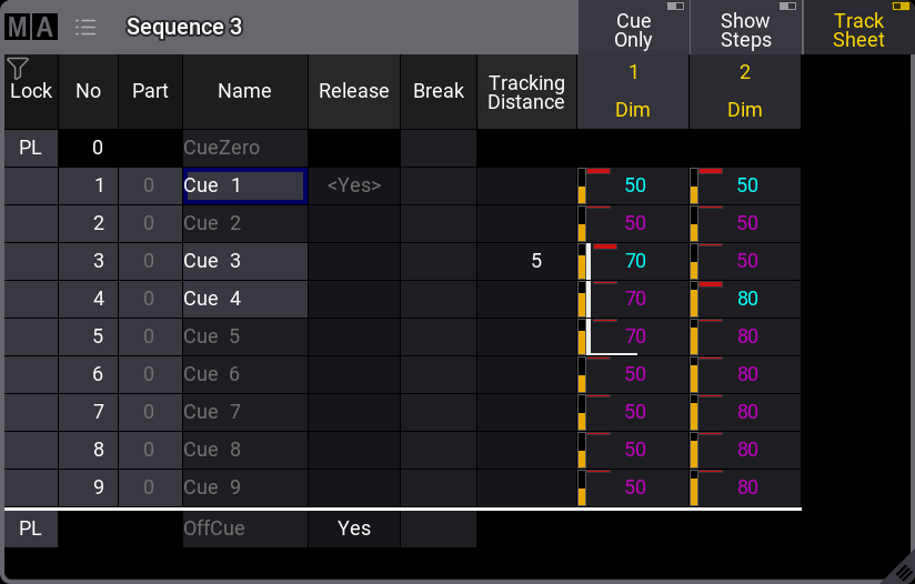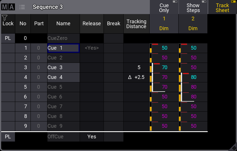A tracking distance is set by editing the Tracking Distance cell for cue number 3.