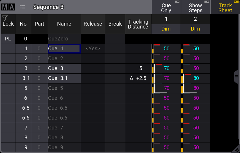 There are two types of tracking distances: Normal tracking tracks until a specific cue number. Delta tracks values to a cue number calculated by the cue number, where it is set, plus a number.