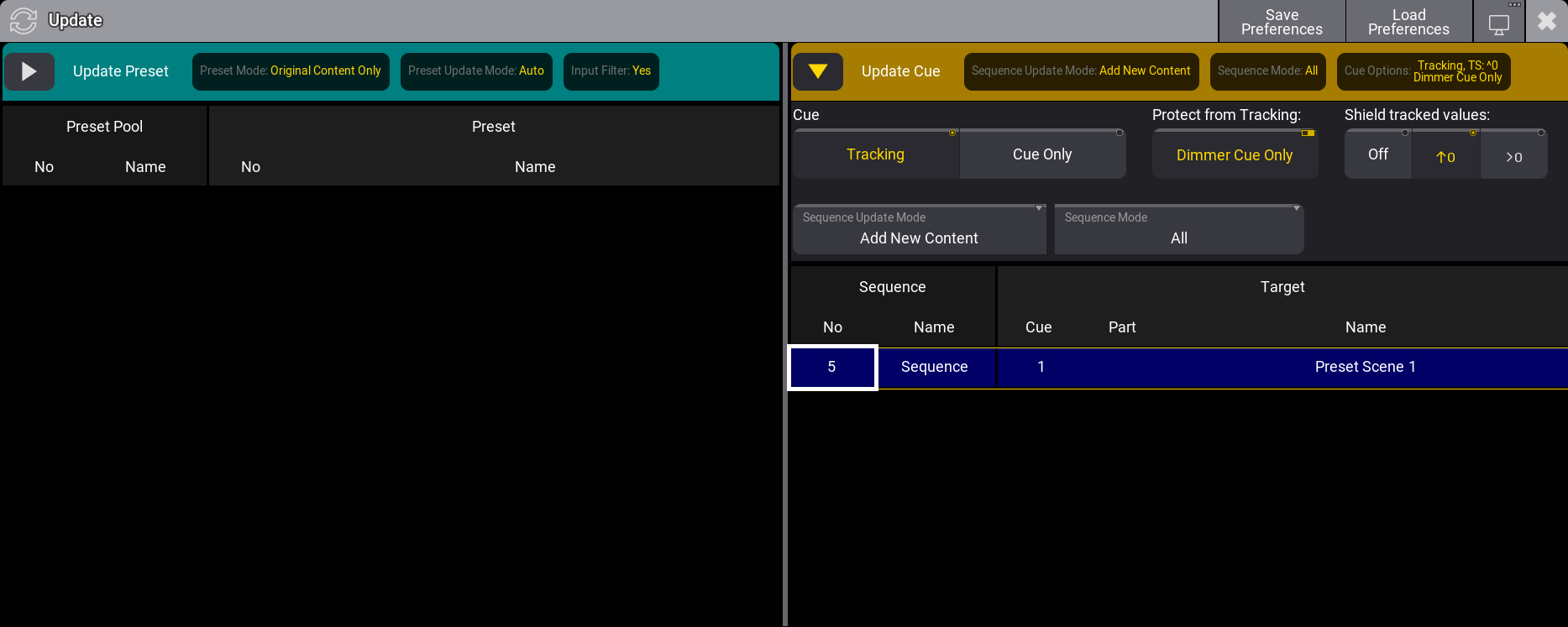 Entire cues can also be selected as the update target. If values already exist in single parts and are updated with the Sequence Update Mode setting to Add New Content, the values will be updated in their respective parts.