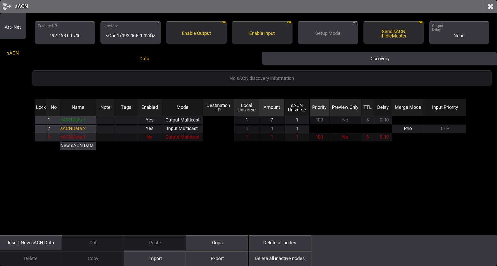 The data tab is a grid of rows and columns. Each row is an sACN configuration. If the row is not valid or not enabled, then the name is in red text. The name text flashes green when sACN data is transmitted. An orange name indicates a possible set-up conflict.