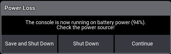 Continue: The console continues running on battery power. Further Power Lost pop-ups appear during battery discharge process. When continued, the console will automatically shut down reaching (0%). The console reboots automatically when power supply is back.