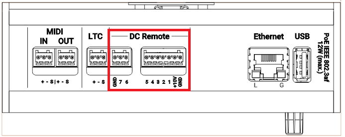 - To use the DC Remote, feed a voltage signal (max. +10V DC into the corresponding input pin. For more information see the pinout image below.