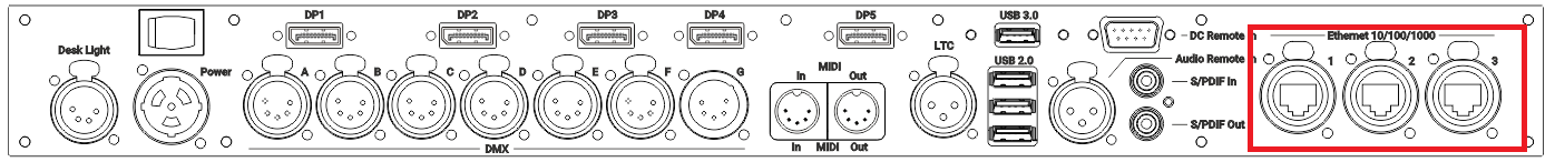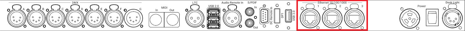 Depending on the type of grandMA3 device, there are up to three Ethernet ports on the rear panel.