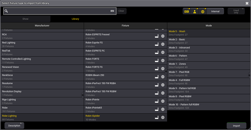 Select a fixture type and then tap Import in the bottom-right corner of the Select fixture type window. The fixture is imported to the fixture type list and can now be patched.