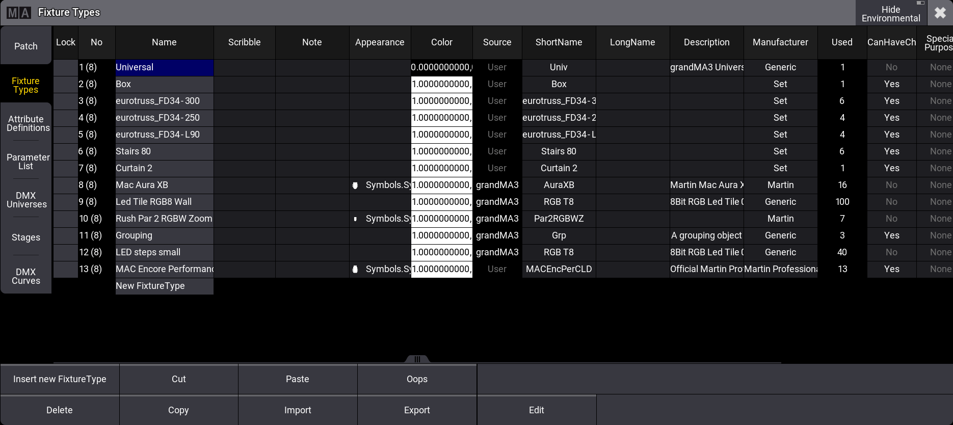 Source: Displays the origin of the fixture type. The source can be grandMA3 or grandMA2 for every fixture from the library (), or User for every fixture from the User () or Share (). User source includes fixture types from the GDTF share and imported grandMA3 fixture types.