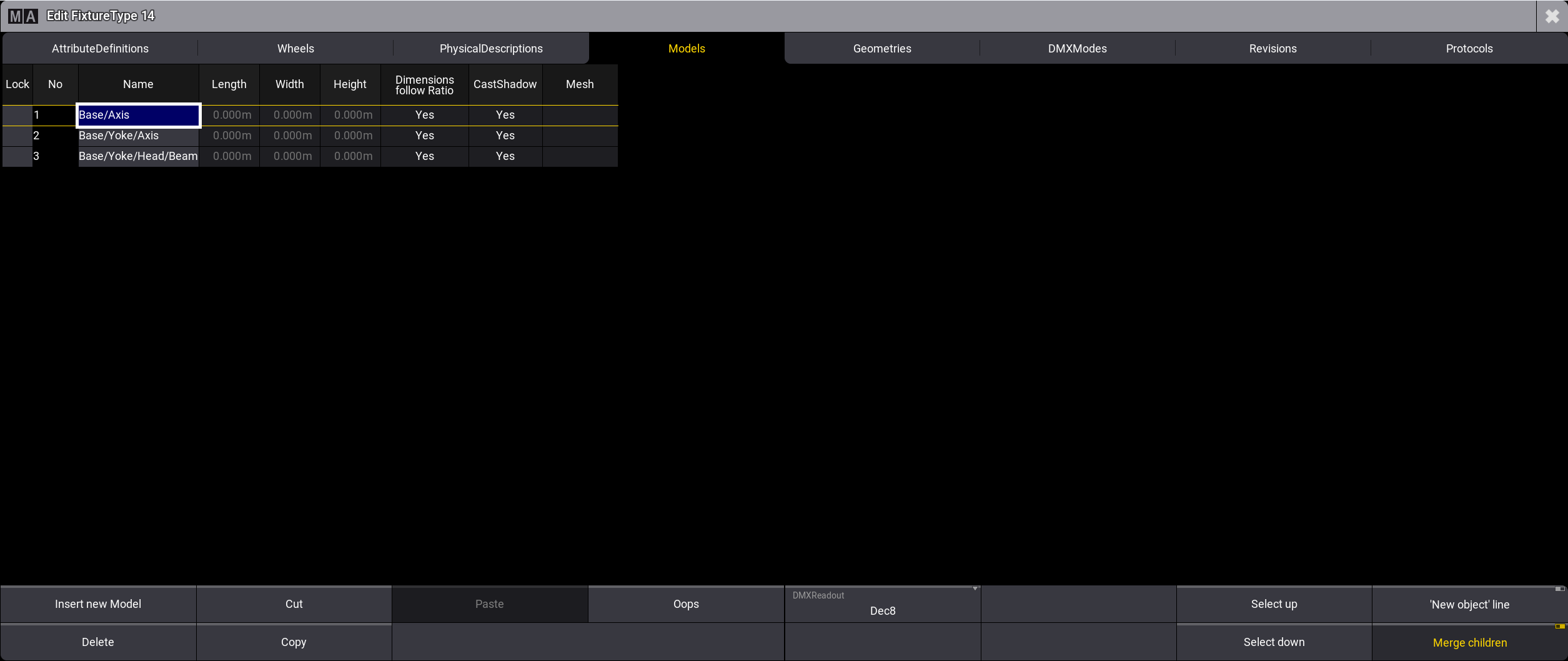 Rename Base/Yoke/Head/Beam into Beam and set its Mesh to [cylinder_3ds]. To represent the fixture correctly, Length, Width, and Height need to be set.