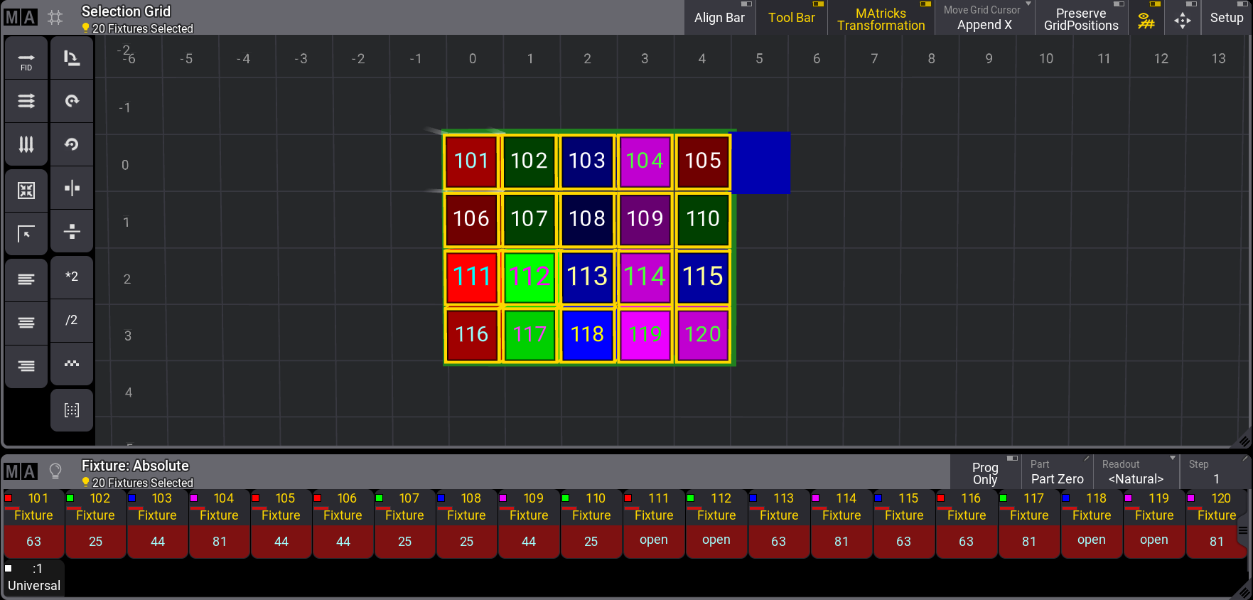 - Use the MAtricks tool to set XWidth to 5. This arranges the fixtures nicely in a 5 x 4 grid.