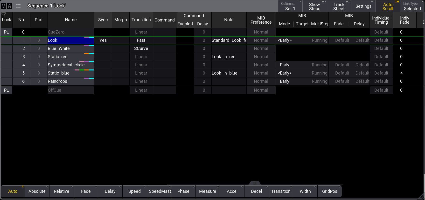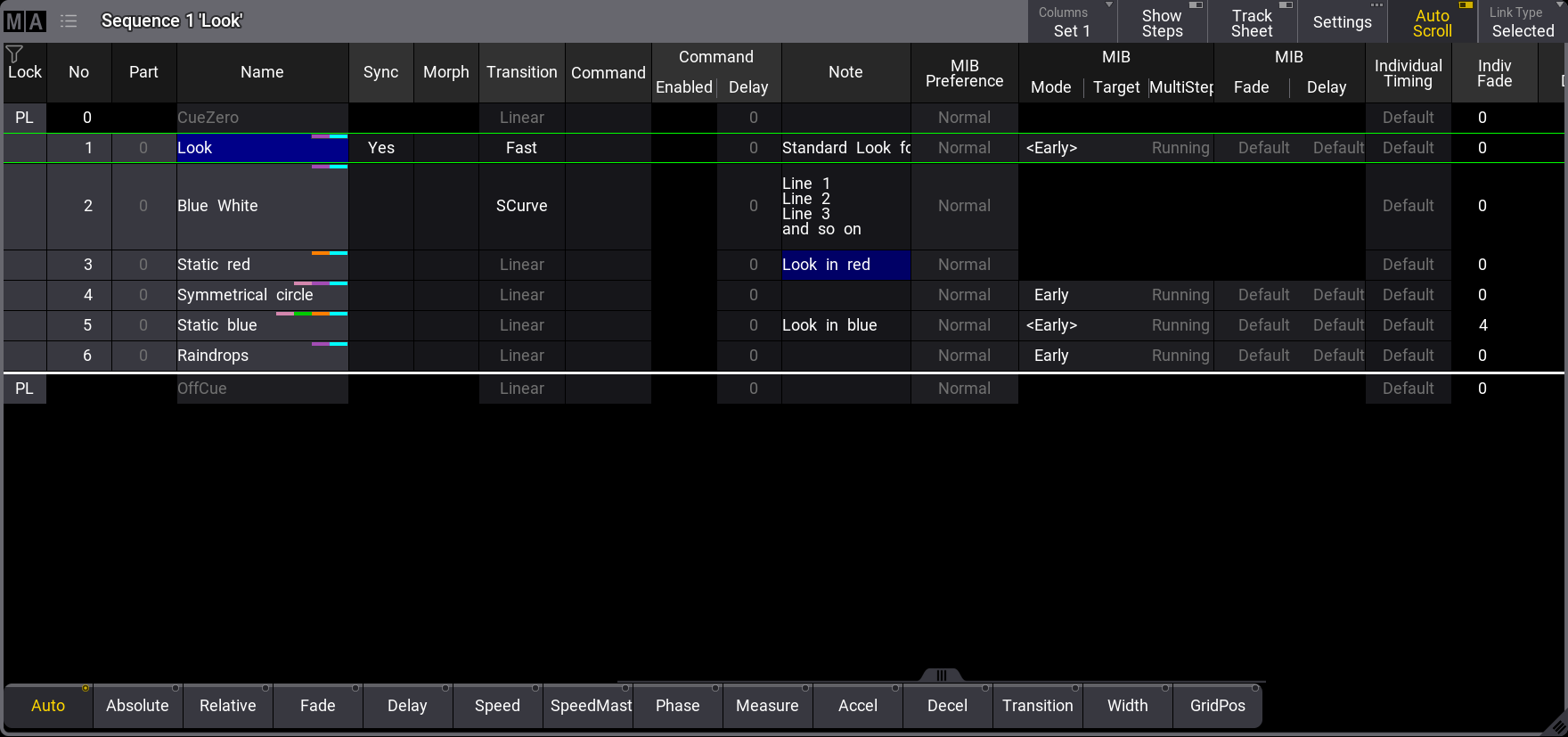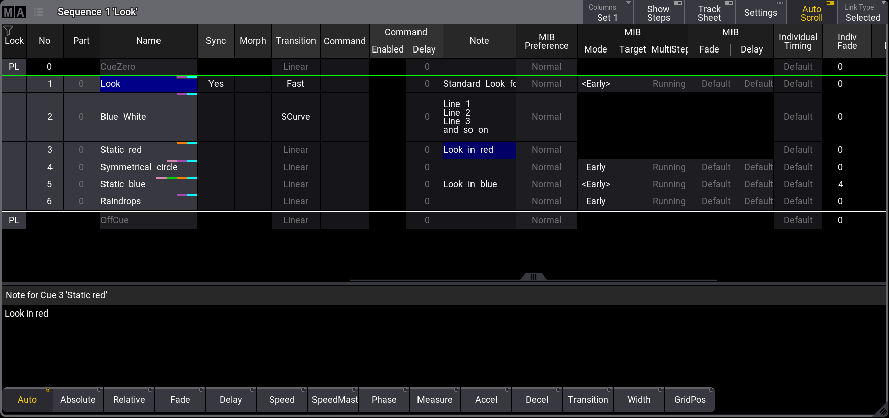 - The text field shows information about the currently selected note. For example, "Note for Cue 1: Look" in the image above.