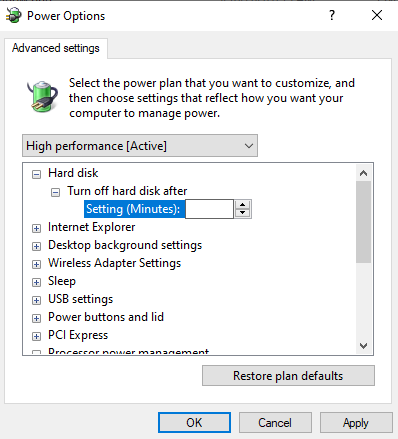- To set Turn off hard disk after to Never, delete the number in the field Setting (Minutes).