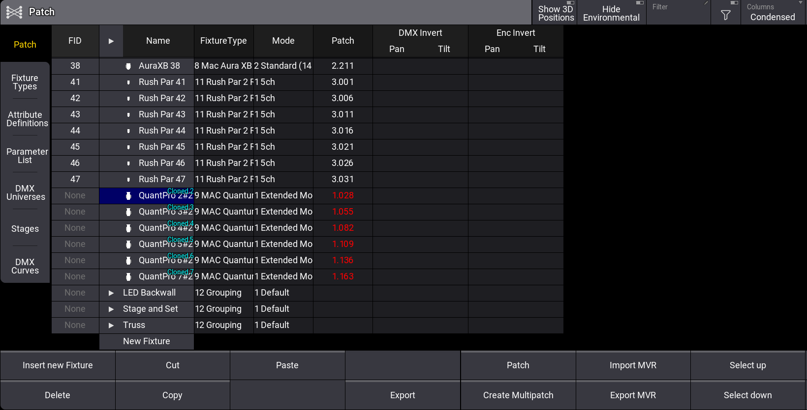 - After copying and pasting fixtures into the Patch, the pasted fixtures get a cyan text (Cloned <FID>) on the right side of the Name cell.