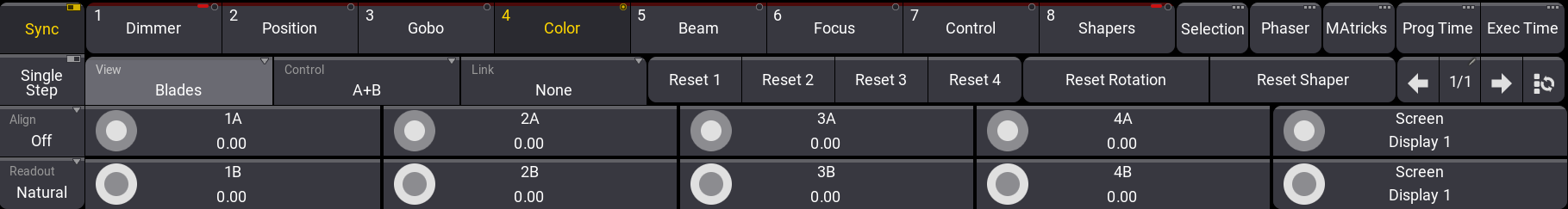 | The faders are grayed out for fixtures with less than 4 blades or fixtures without a full set of attributes to control a blade. The handles for missing blades are adjusted accordingly in the graphical view. |