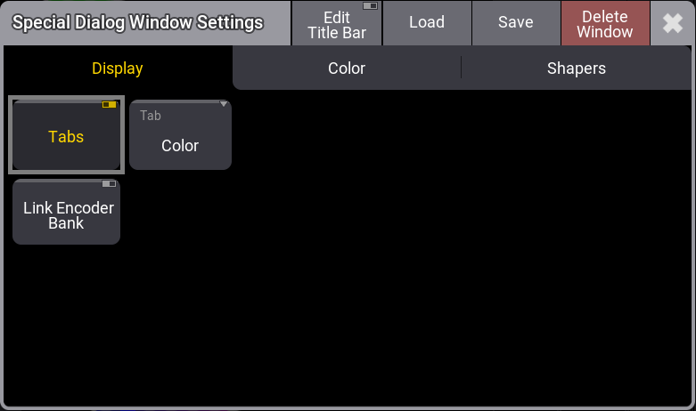 The Color tab and the Shapers tab on the left side in the Special Dialog window can be used to switch between the different functions. In the Special Window settings, these tabs can be shown or hidden by toggling Tabs. For more information about window settings in general, see Window settings.