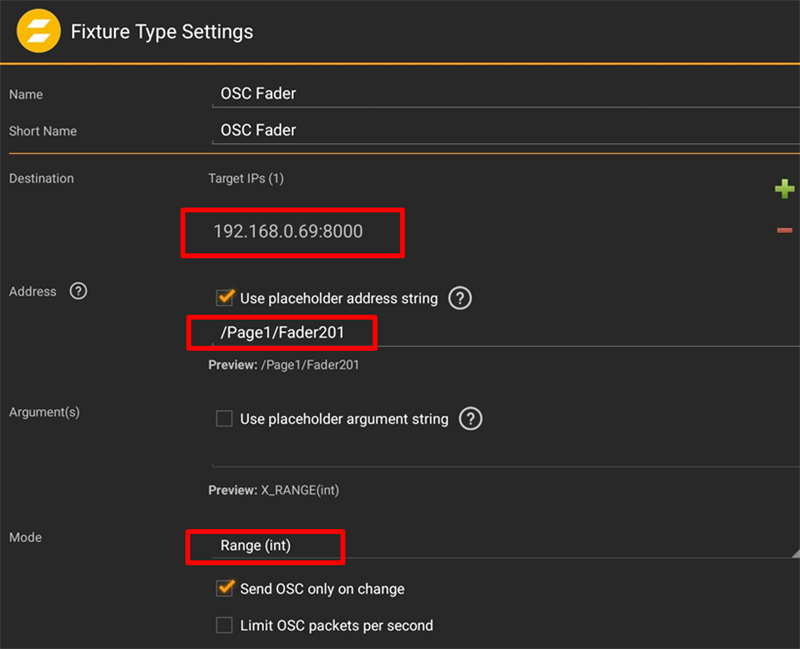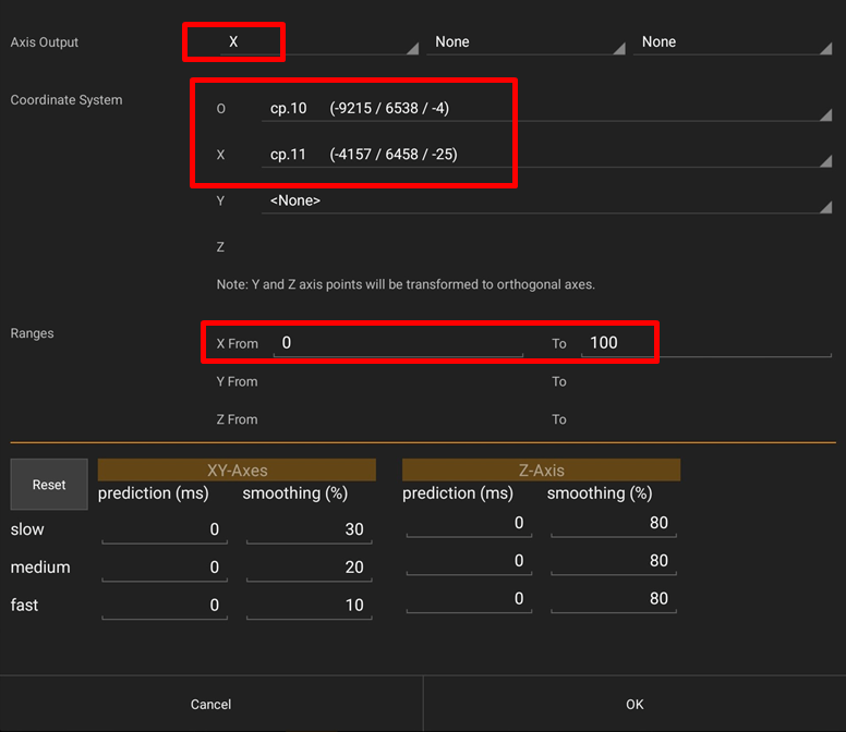 - Set the X Range for the fader. These values must match the corresponding setting in the grandMA3 software. The default value is 0 to 100.
