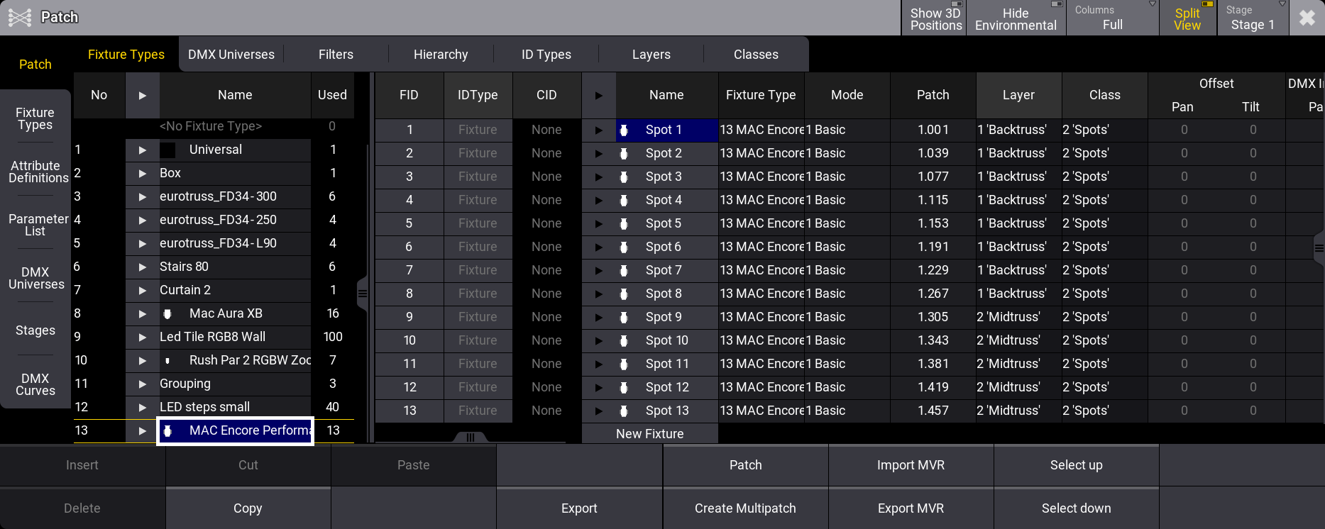 The left side lists the DMX universes, including <All> (all universes) and <Unpatched> (fixtures without an assigned DMX address). Learn more about DMX universes in the DMX Universes topic. -