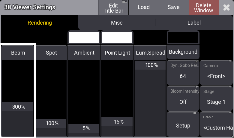 This controls how visible the difference in brightness between different fixture types is. The fixture type with the highest luminous intensity defines this intensity as 100% brightness in the 3D Viewer window. When fixture types are used that have a much lower Luminous Intensity, they will be rendered much darker at their 100% dimmer output.