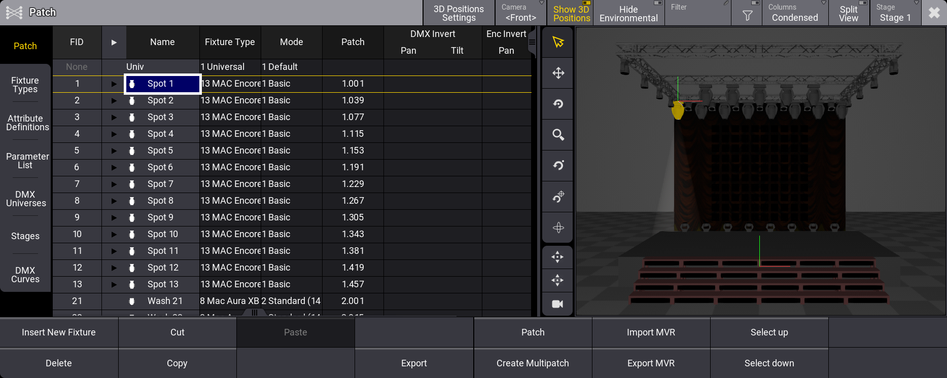A row now represents each new fixture in the patch menu. Read below for an explanation of each column in the patch menu and detailed information about changing some values.