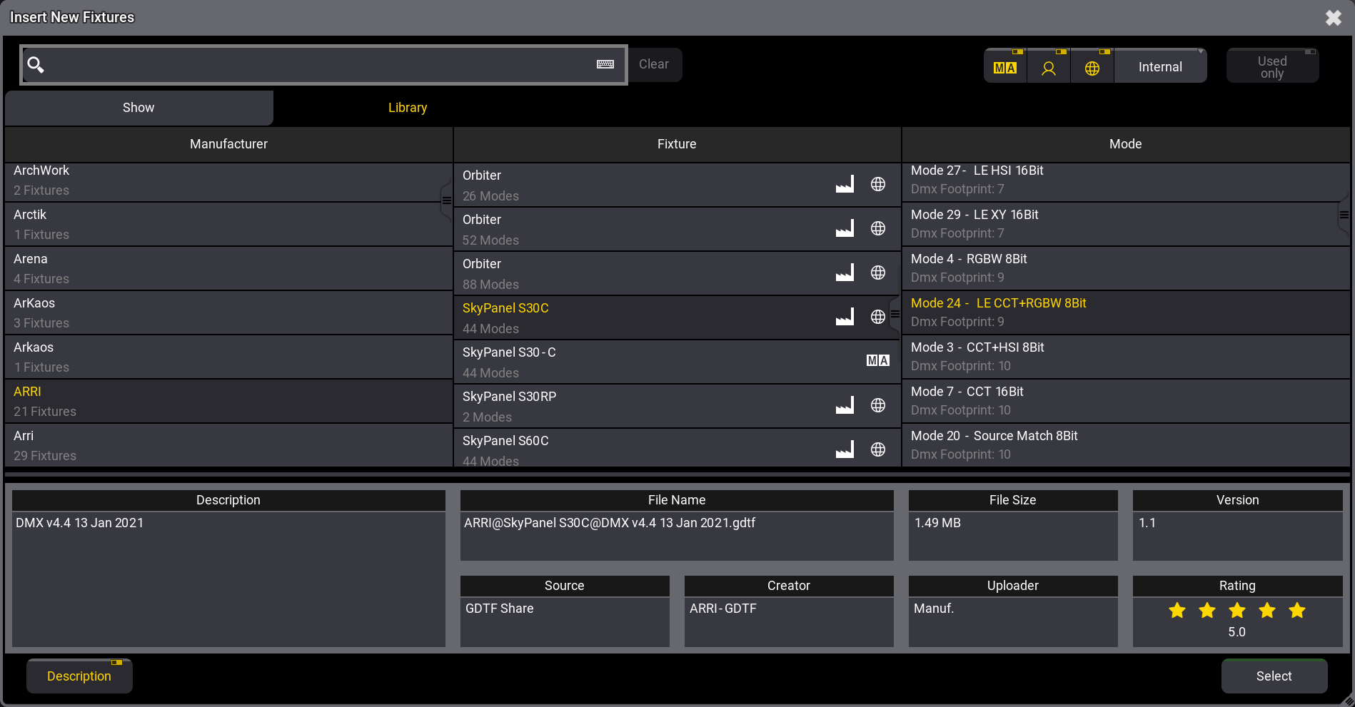 - Select the desired fixture and mode from the list and tap Select.
