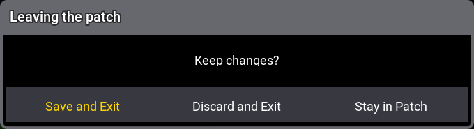 Tap Save and Exit to save the changes and leave the patch menu. Tap Discard and Exit to cancel any changes and leave the patch menu. Tap Stay in Patch to stay in the patch menu.