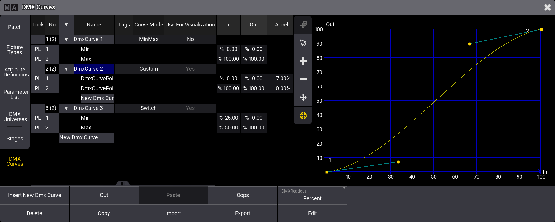 The curves are displayed, created, and edited in the DMX Curves menu found in the patch.