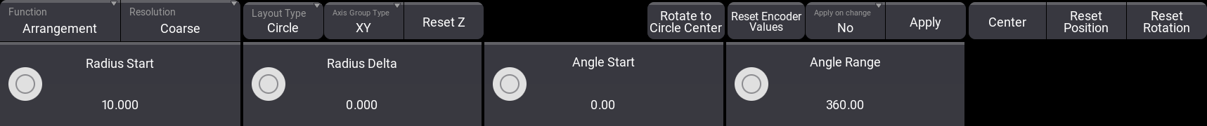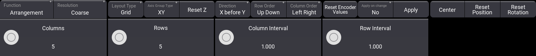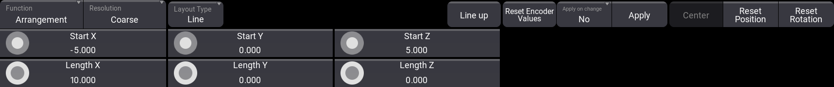 There are three types of arrangement: Line, Grid, and Circle. These different types change the available buttons in the encoder bar and the functions of the encoders. -