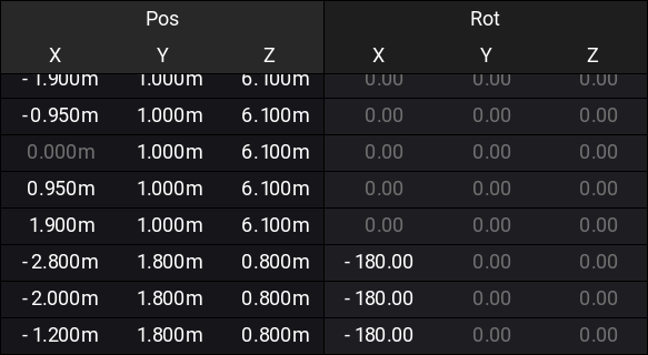 In the patch, there are rows for each fixture, and there are columns with position and rotation values: