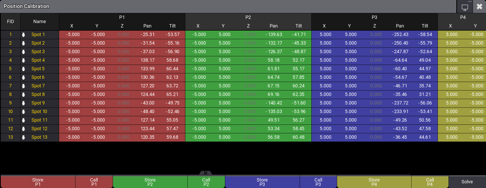 - Position each fixture using pan and tilt to each of the calibration points, and store these positions.