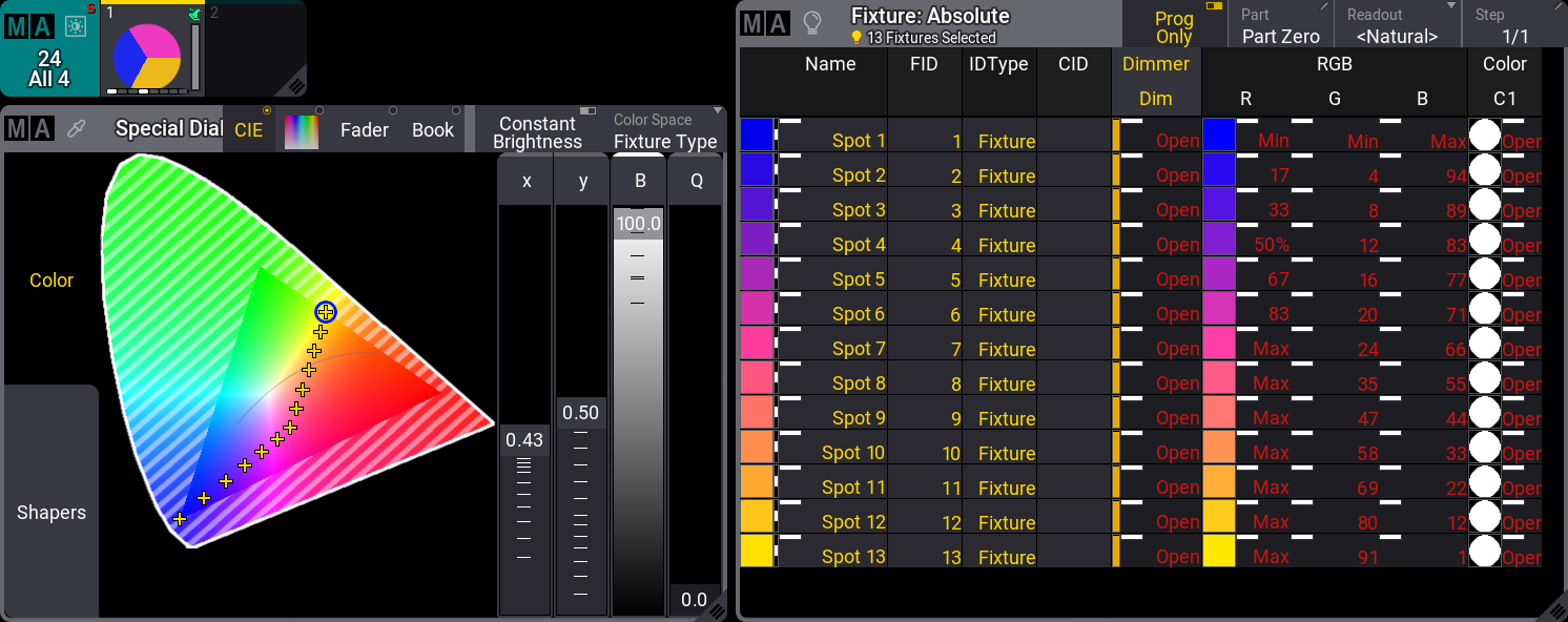 - Create a view with the Special Dialog - Color Picker (in CIE mode) and an All preset pool.