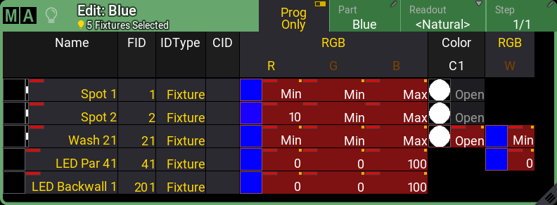 | Editing a preset calls the values into the programmer, which is sent to output unless Blind mode is activated first. |