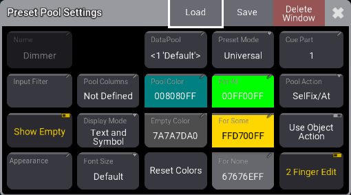 Tap the MA logo on the dimmer preset pool title object to open the preset pool settings: