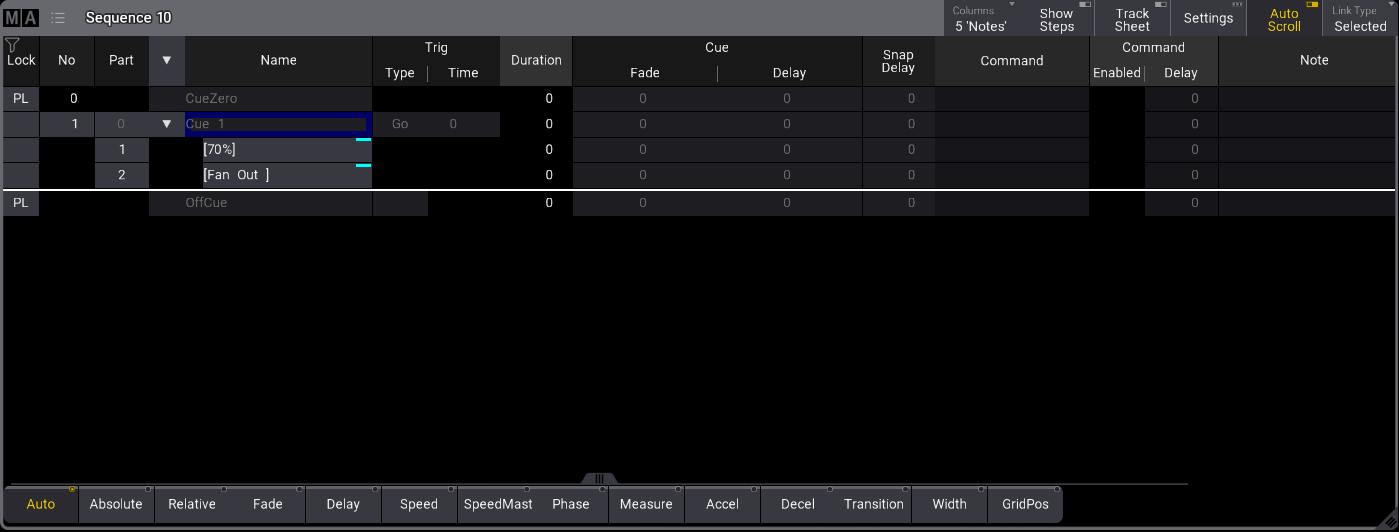 Cue one was stored with part one for dimmer preset values and part two for position values.