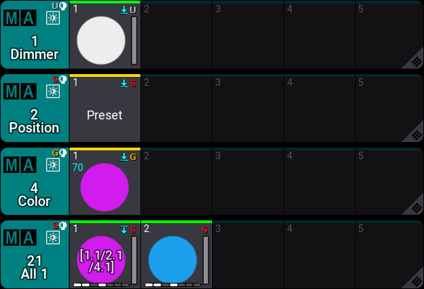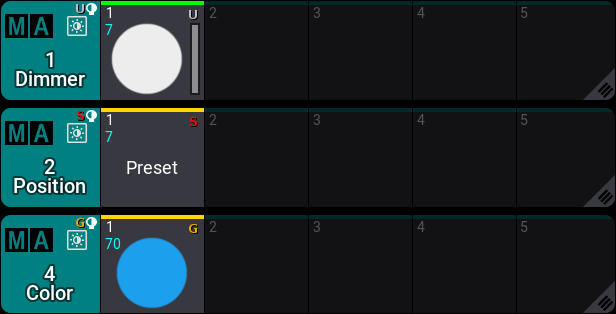 The position preset got a small red "S". This tells us it is a Selective preset. Selective presets only contain values that can be used by the fixtures that had the values when the preset was stored.