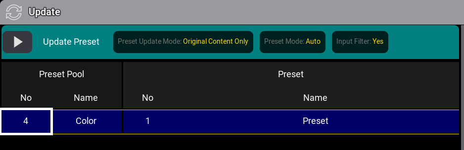 Press Store and click the first preset pool object in the color preset pool - not the title field, but the one with a small "1" in the upper left corner.
