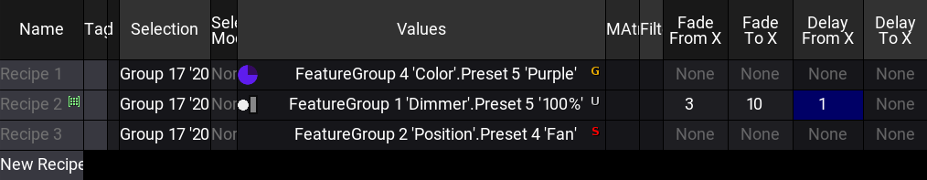 Scroll the recipe to the right to show the four "Fade" and "Delay" columns.