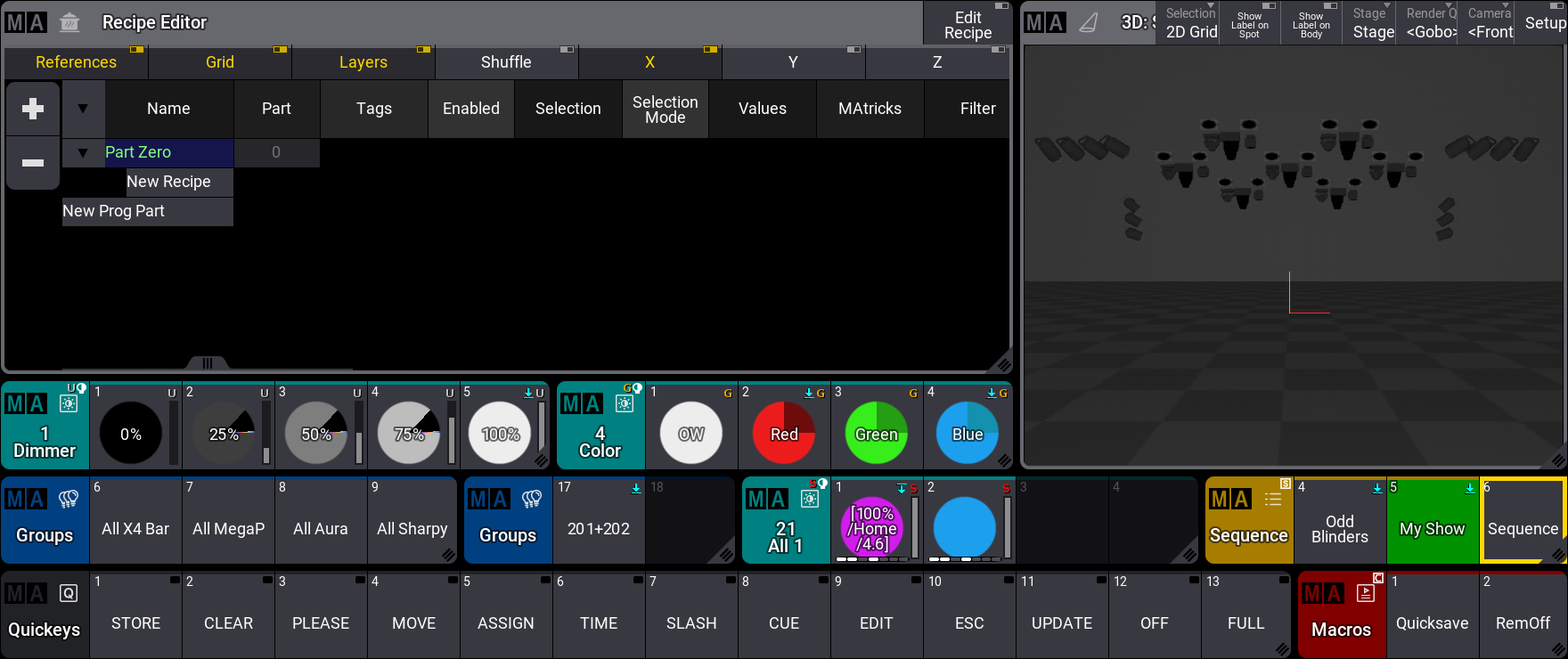 This shows us that a recipe can be stored in a cue part or preset, which can then be used in a cue part. It also shows an element called "MAtricks", which is currently out of the scope of the quick start guide.