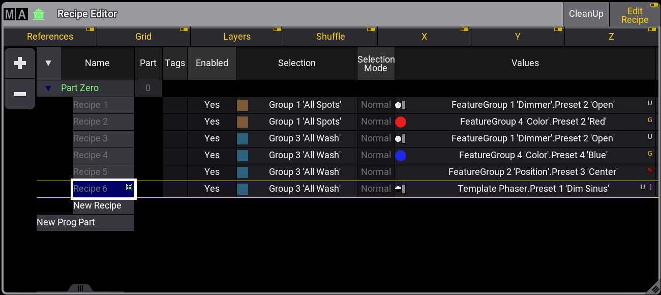 A recipe line can contain information about a selection of fixtures, group, preset, MAtricks, individual fade, delay, speed, and phase values.