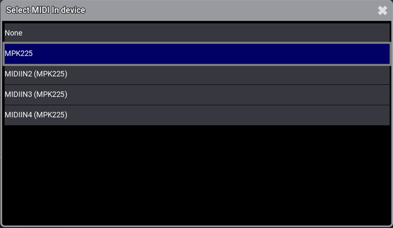 - Select the external MIDI device. In the example it is MPK225 as shown in the image below: