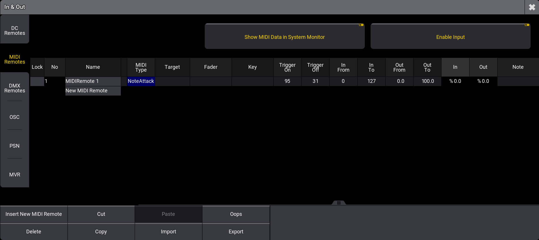 - To adjust the settings of the MIDI Remotes, switch to the In & Out window.