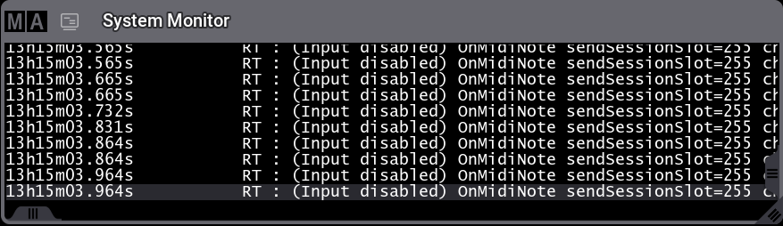 | If the data input is disabled, a text in the System Monitor next to the actual MIDI Note will inform the user about it. |