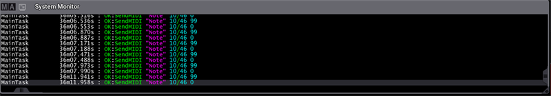 - To see the incoming MIDI messages of the external MIDI device on the console, open the System Monitor window and press different hardkeys (for example the keys) on the external MIDI device. The MIDI messages are listed in the System Monitor as shown in the image below: