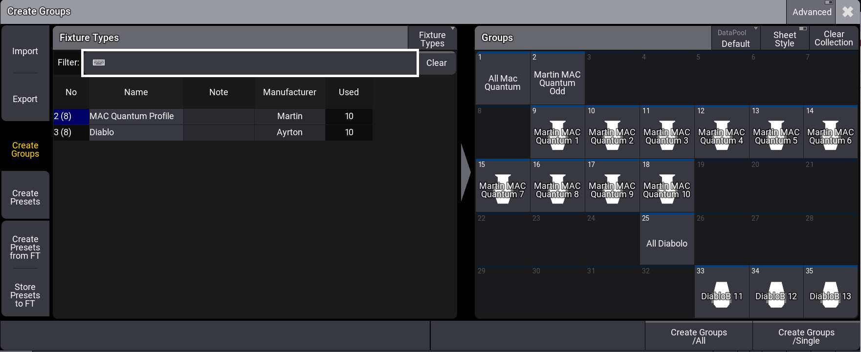 - Tap Create Groups /All to create a group with all fixtures for the selected objects or Create Groups /Single to create single fixture groups. To learn more, see the AutoCreate keyword.