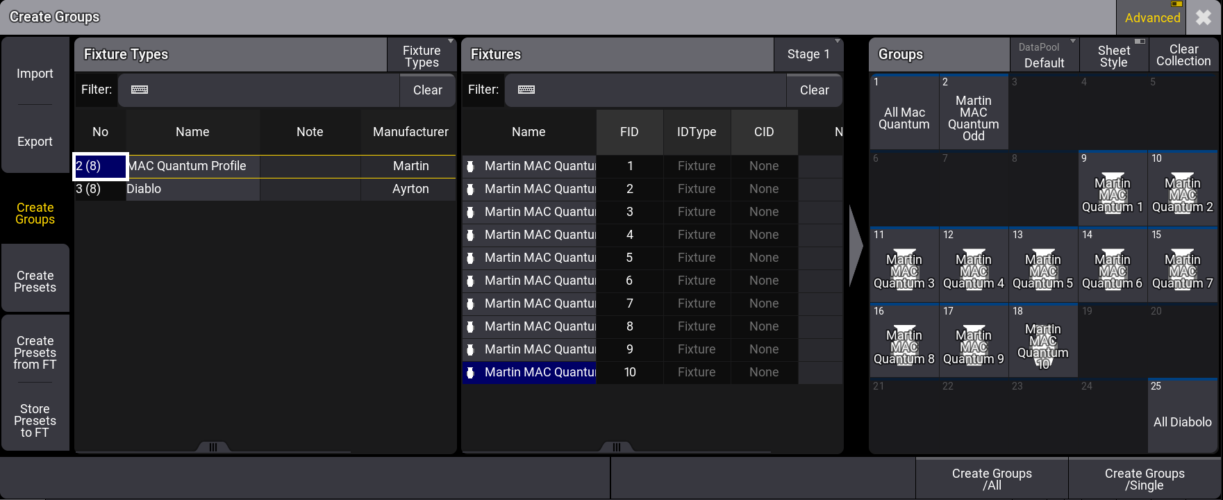 When tapping Advanced on the Create Groups title bar, a center area appears. This area allows the creation of groups based on a reduced set of fixtures.