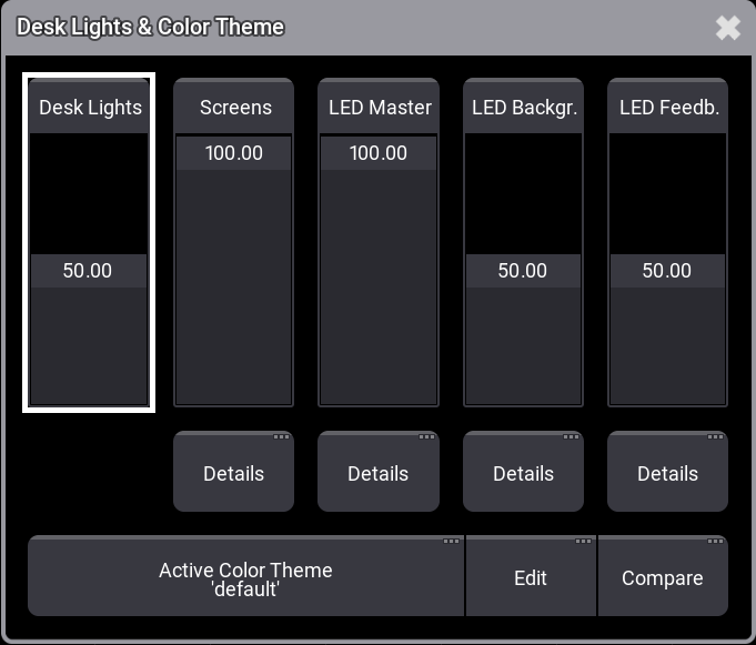 - To adjust the LED background intensity of the individual elements, tap Details below the LED Master fader.