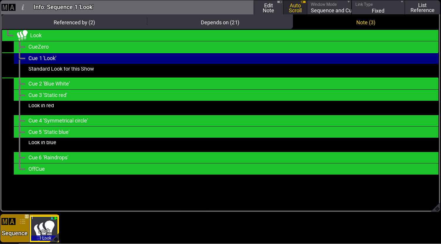 - Sequence and Cues / Macro and MacroLines: Displays the notes of the parent object and all cues/macro lines.