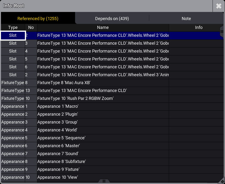 - To list all references and/or dependencies in your show file, type ListReference into the command line and press Please. The Info window pop-up opens: