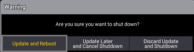 in the Shutdown Menu to install delayed updates. This will open a second warning pop-up.