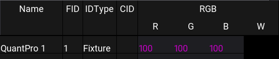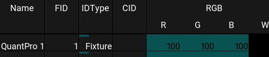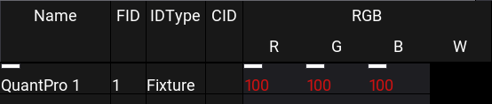 White fixture names and IDs on a dark gray background indicate fixtures that are not selected. It is the default color combination.